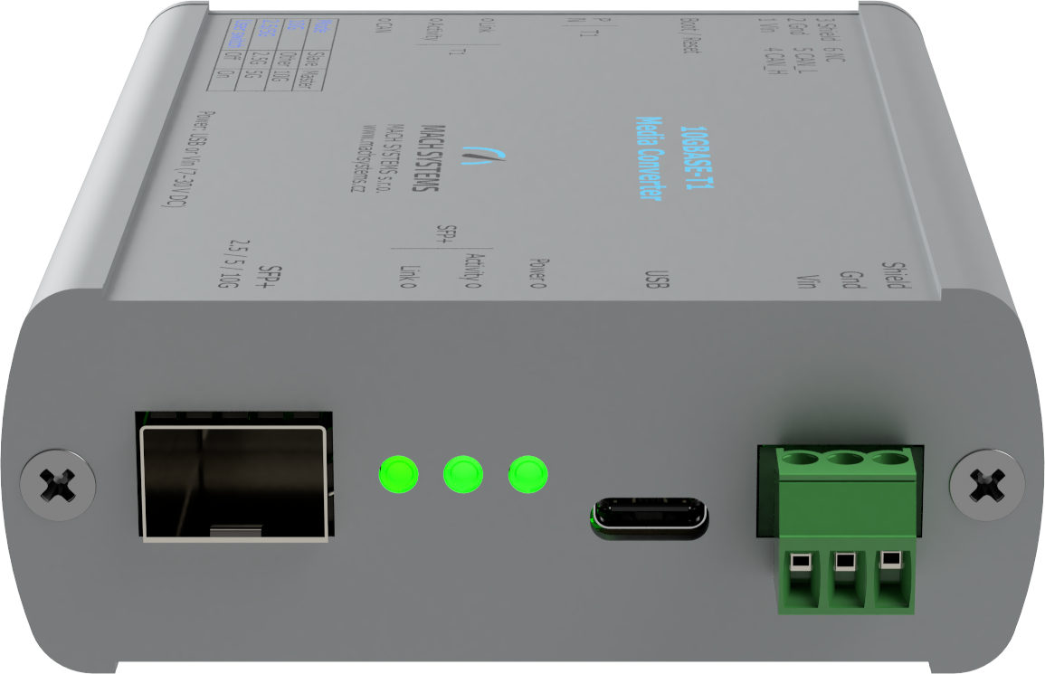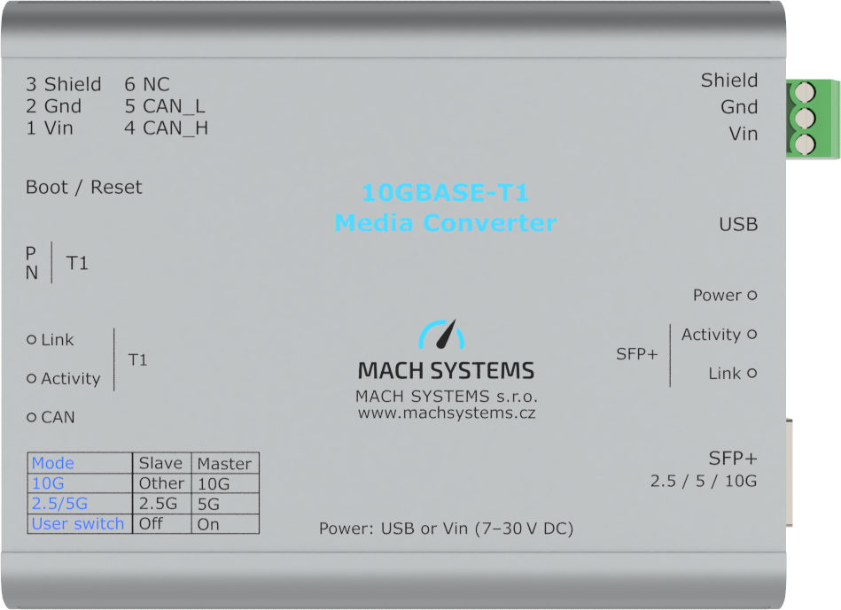 10GBASE-T1媒体转换器是一款车载MultiGig-T1以太网(MultiGBASE-T1)转标准以太网(MultiGBASE-T)的设备,支持10GBASE-T1、5GBASE-T1及2.5GBASE-T1标准。该转换器实现了2.5/5/10千兆车载以太网(IEEE 802.3ch)与铜缆/光纤SFP+模块之间的双向物理层转换。