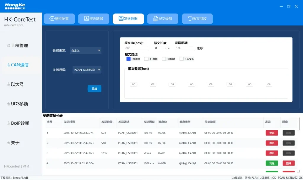 HK-CoreTest软件全面支持CAN与CAN FD协议。您可灵活配置多种CAN硬件及波特率,实现报文的精准发送与稳定接收。无论是模拟ECU主动发送,还是实时监听、过滤并解析总线流量,都能轻松胜任。