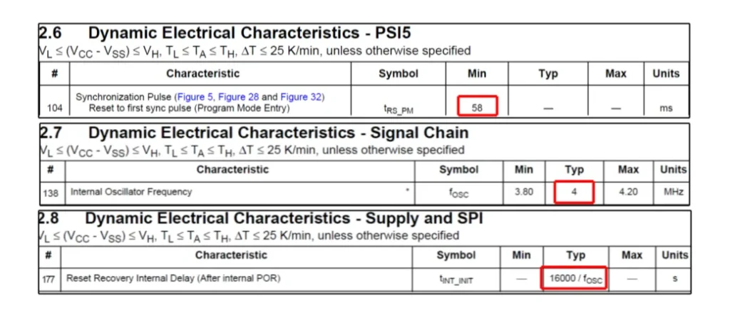 具体参数验证:该演示中,虹科PSI5传感器指定的同步脉冲至少为58ms;传感器内部振荡器频率fosc为4MHz,换算后为0.00025ms。