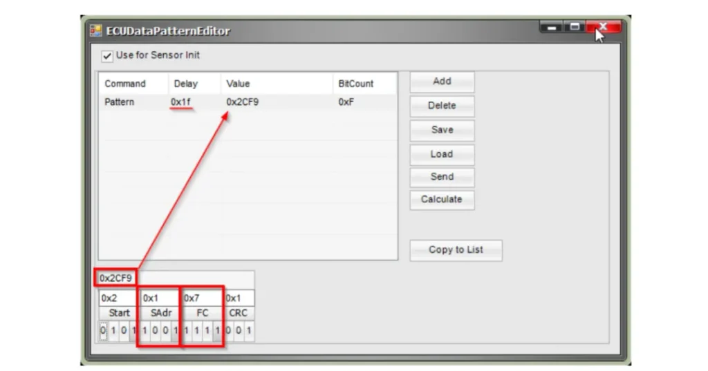 数值转换与填入:一般参数值都会以十六进制列出,需转换为十进制值。(此处,SAdr的十进制值为1,FC的十进制值为7),在ECU模式编辑器中填入对应内容,最终数值0x2CF9(含CRC、SAdr、FC等核心字段)。