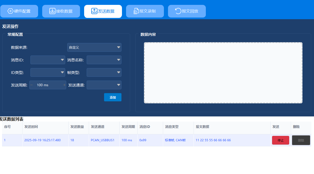 侧边栏【CAN通信】→ 顶部标签【发送数据】