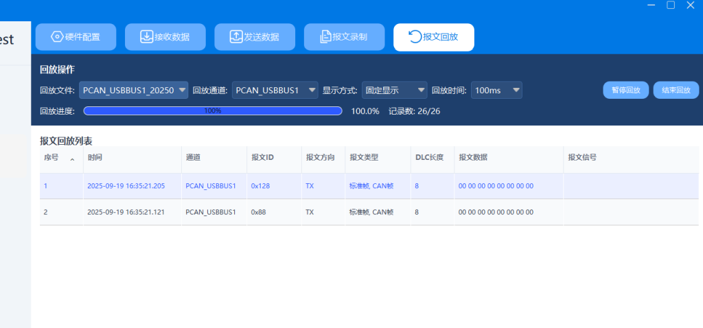 【报文回放】:选取录制文件,配置回放速率与通道,执行回放。