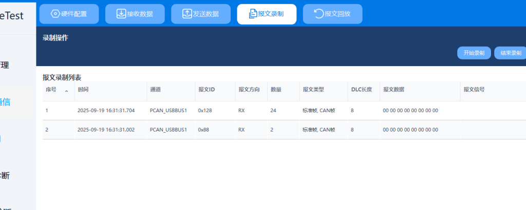 侧边栏【CAN通信】→ 顶部标签【报文录制】 / 【报文回放】