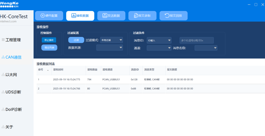 侧边栏【CAN通信】→ 顶部标签【接收数据】