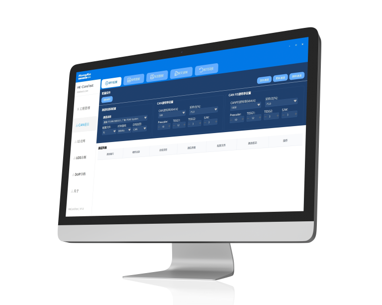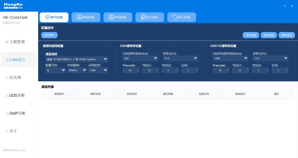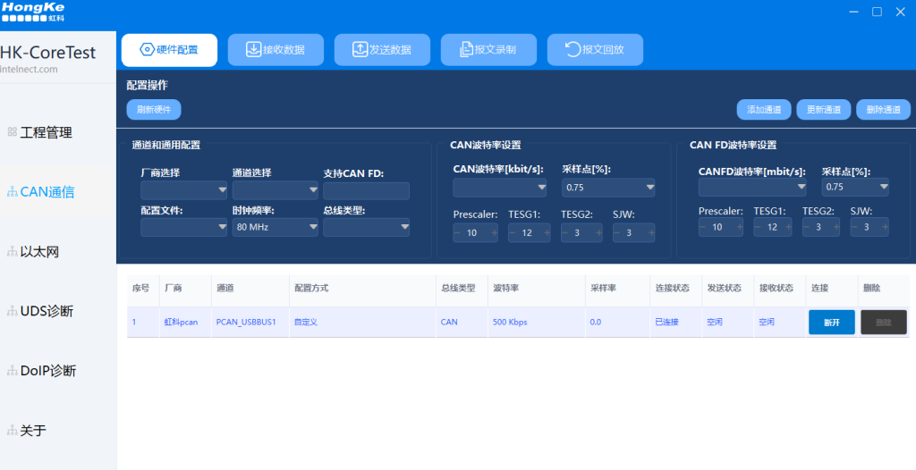 • 硬件配置:支持CAN设备厂商和通道配置,支持标准CAN波特率(125K-1M)和CAN FD高速波特率(8M)