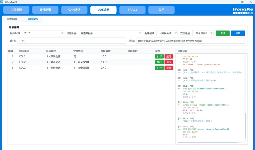 • UDS 诊断服务:多 ECU 并行诊断、支持 28 个 UDS 标准服务、支持单次/序列执行