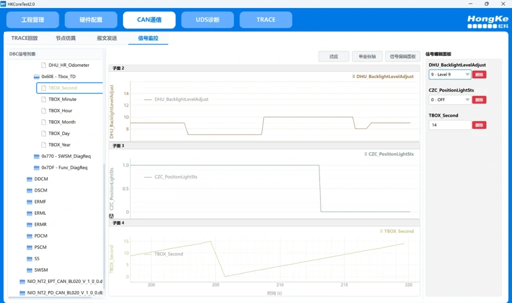 • 信号曲线监控:支持多信号并行监控、多 Y 轴独立缩放、可实时修改和监控信号变化趋势
